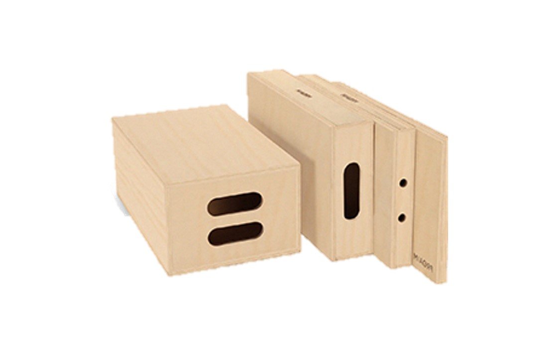 A complete kit of Apple Boxes containing one of each standard size (Full, Half, Quarter, and Pancake) to provide various height options