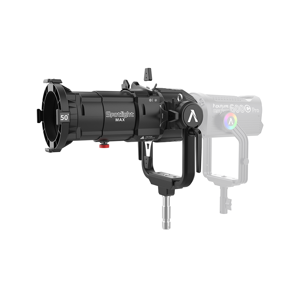 The Aputure Spotlight Max 50° Lens is a wide-angle projection modifier optimized for high-output LEDs from 600 W to 2600 W. It features advanced telecentric optics for edge-to-edge uniformity, a built-in four-leaf shutter, and a rotatable gobo clip for precise light shaping.