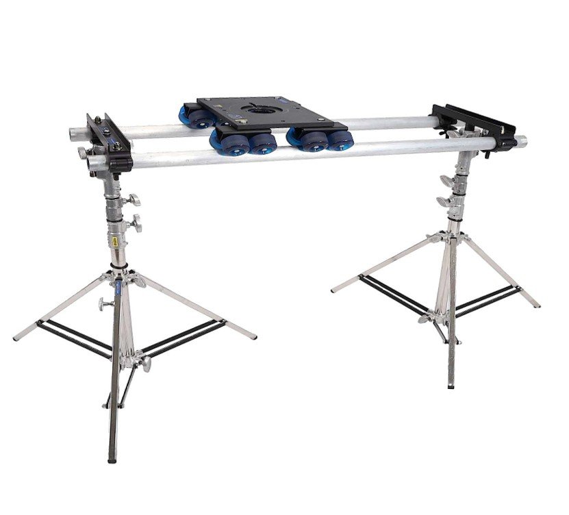 The Dana Dolly is a heavy-duty portable slider featuring a 16-wheel design with precision ABEC-7 bearings for silent, vibration-free movement. Built from machined aluminum, it supports a 45.4 kg (100 lbs) payload and includes an integrated Mitchell mount with 75/100/150mm bowl adapters. It is designed to run on standard Speed Rail (1.25" to 1.5" pipe) using universal track ends compatible with Junior or Baby stands