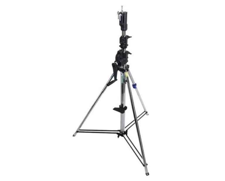 The Matthews Mombo Combo Overhead Stand or "Daddy Long Legs" is a premier heavy-duty support reaching 24 feet (7.3m) maximum height. It supports payloads up to 88 lbs (40 kg) and features an extra-wide 74-inch footprint for stability at extreme elevations. It includes a 4.5-inch grip head (lollipop) and a Junior receiver, along with a Rocky Mountain leveling leg for uneven terrain.